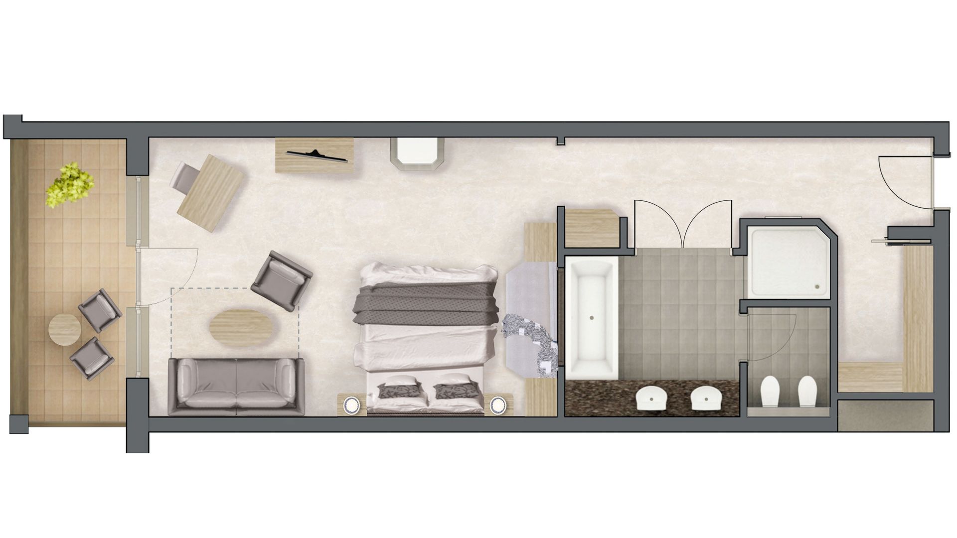 für 2–4 Personen, ca. 60 m², 1-Raum-Suite mit komfortablen Betten, Wohnecke mit ausziehbarer Couch, begehbarem Kleiderschrank, Holzboden und Südloggia. Tiefgarage im Guesthouse P inklusive.